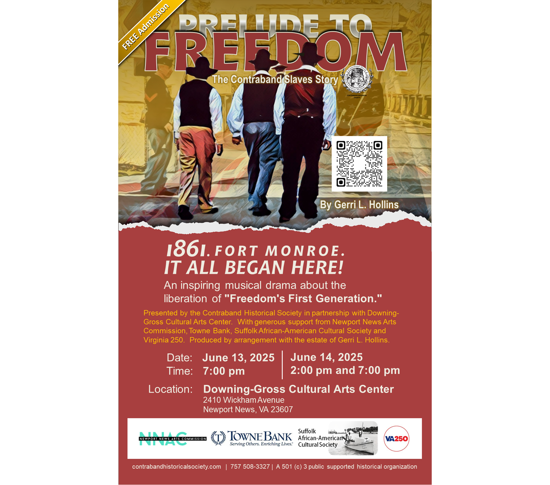 “Prelude to Freedom” was composed and written by Gerri L. Hollins, an accomplished musician, founder of the Contraband Historical Society, and a direct descendant of the first “Contrabands.”  The drama combines stirring original music with gripping historical storytelling, drawing on real family struggles and the courageous acts of those who dared to seek freedom in 1861.